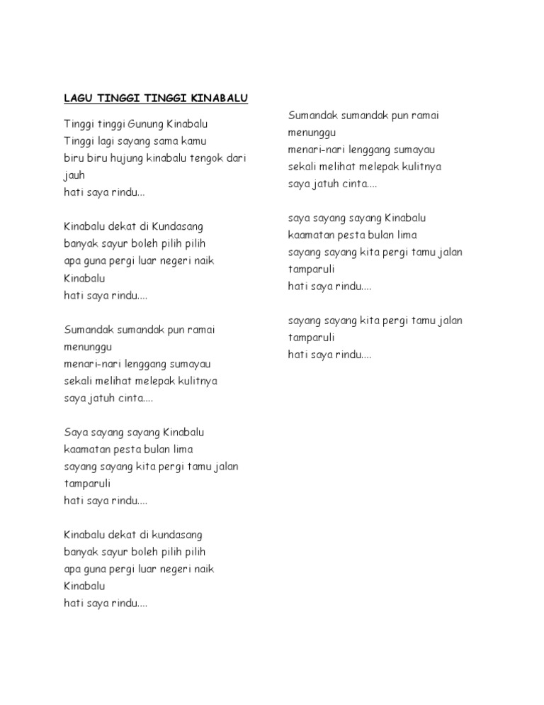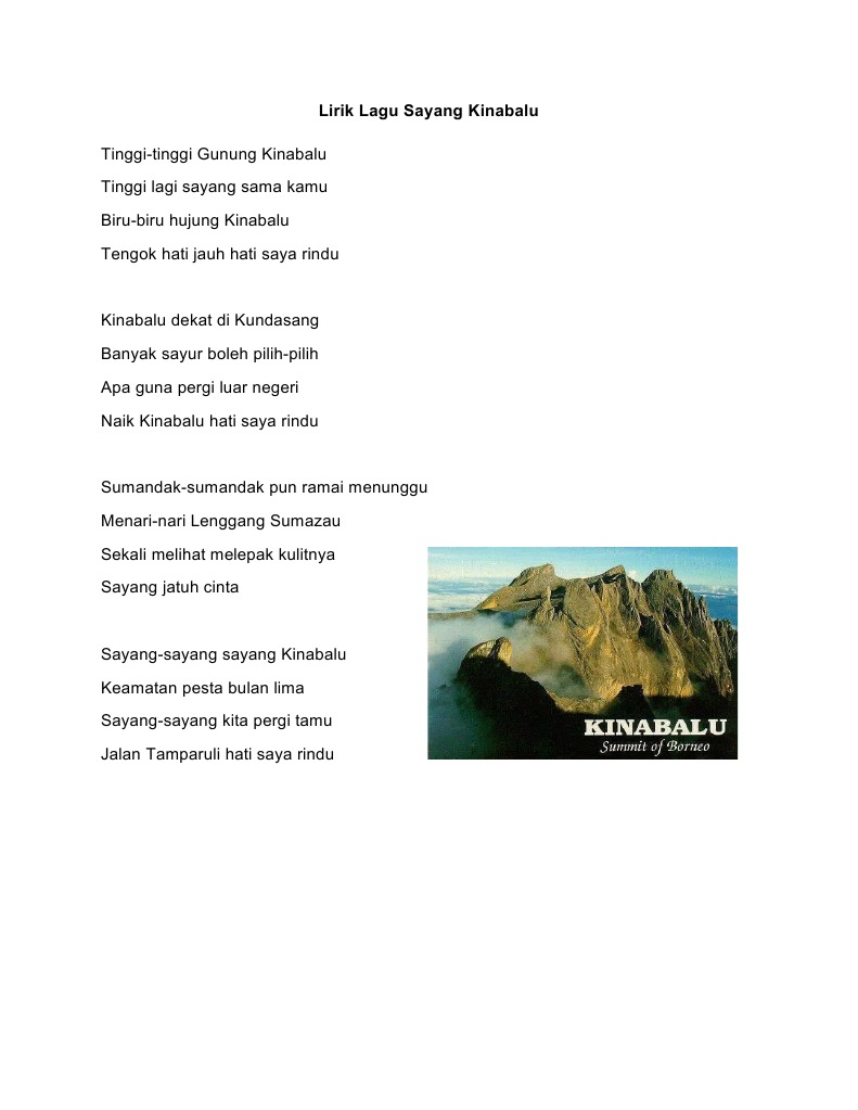 Lirik Lagu Sayang Kinabalu from imgv2-2-f.scribdassets.com Cik ain akak polis cantik nyanyi lagu tinggi tinggi gunung kinabalu. Lagu gunung kinabalu lirik hd mp3. Gayo ngaran or nulu nabalu) is a mountain located at kadamaian, kota. Dapatkan lirik lagu lain oleh payung teduh di kapanlagi.com. Sumandak sumandak pun ramai menunggu. Loading the chords for 'lagu gunung kinabalu lirik hd'. Lagu gunung kinabalu lirik hd. Lagu gunung kinabalu lirik hd mp3 duration 3:24 size 7.78 mb / mr ezzal 2.