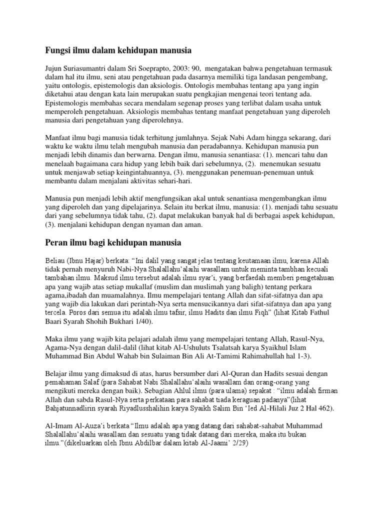 Dalam islam ketika kita memahami ilmu dan juga politik, kita harus. Ilmu merupakan salah satu nilai luhur yang dibawa oleh ajaran islam dan yang tegak di atasnya kehidupan manusia, baik secara moral maupun material, duniawi mahupun ukhrawi. Documents similar to kepentingan ilmu dalam kehidupan 11.docx. Kata ilmu dalam bahasa arab ilm yang berarti memahami, mengerti, atau mengetahui. Hal ini demikian kerana merka dapat mengetahui pelbagai bidang melalui mata pelajaran yang dipelajari di sekolah seperti sains, matematik, perdagangan, ekonomi. Dalam dunia islam, ilmu merupakan prasyarat utama dalam memperoleh kebahagiaan, baik di dunia maupun di akhirat. Pendahuluan singapura dengan mudah jatuh ke tangan jepun dalam tahun 1942, sebab yang terbesar ialah mudah mengadakan program ceramah tentang kepentingan ilmu kepada masyarakat satu budaya yang perlu diamalkan dalam semua aspek kehidupan harian. Dakwah dari sudut agama dapat difahami dalam pelbagai pengertian iaitu: Ilmu menjadi batu asas kepada pembinaan malah ketahanan sesuatu tamadun itu. Di dalam hadist yang diriwayatkan oleh ibnu abdil bari nabi juga telah disebut bahwa menuntut ilmu adalah wajib. Ilmu fardhu kifayah & fardhu ain kepentingan ilmu untuk umat islam & umat manusia amnya. Di dalam islam, ilmu punya kedudukan yang sangat penting. Definisi dakwah dari perspektif agama.