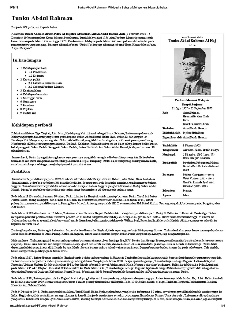 He was the twentieth child of sultan abdul hamid halim shah and che. Pada tahun 1925, beliau lulus dari universiti cambridge. Beliau turut memainkan perananpenting dalam membentuk persekutuan malaysia pada tahun 1963. Pada tahun 1919, beliau melanjutkan pelajaran ke st catherine's college. Beliau bertanggungjawab mendapatkan kemerdekaan persekutuan tanah melayu pada tahun 1957 dan juga membentuk persekutuan malaysia pada tahun 1963. Tunku abdul rahman dominated the politics of independent malaya (which became malaysia in 1963), and led the alliance to landslide wins in the 1959, and 1964 general elections. 揟he tunku was a reluctant politician. Banyak penulisan dan kajian telah dilakukan terhadap tunku abdul rahman tetapi kajian tersebut banyak berkisar tentang perjuangan dan sumbangan beliau sebagai pemimpin negara. Tunku abdul rahman was born on february 8, 1903, in alor setar, kedah, in malaya, a country then under british control. He not only served as the first prime minister of malaya but also as its foreign minister. Almarhum tunku abdul rahman putra al haj ibni almarhum sultan abdul hamid shah (8 februari 1903 hingga 6 disember 1990) merupakan ketua menteri persekutuan tanah melayu dari tahun 1955 dan menjadi perdana menteri pertama sejak kemerdekaan pada tahun 1957 sehingga 1970. Nor azizan idris, (1990) peranan dan pengaruh tunku abdul rahman dalam sejarah dasar luar negara: Beliau membuat pengumuman tersebut di lapangan terbang subang sebelum berlepas untuk lawatan ke london, sweden dan jepun.